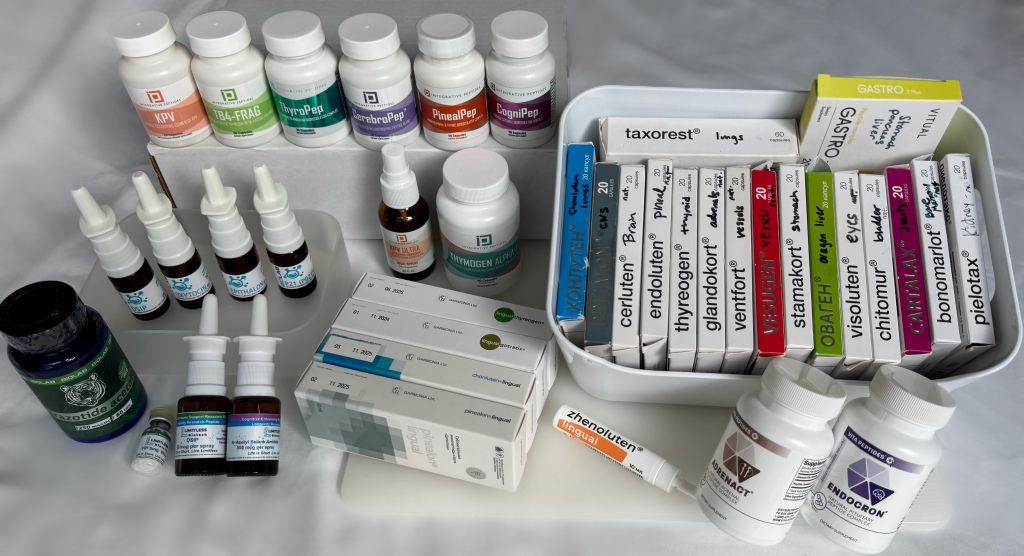 Single Organ Bioregulator Peptides: See this post for: Adrenals – Bile – Bladder – Blood Vessels – Bone Marrow – Brain / CNS Cartilage – Collagen- Gastric Mucin – Heart Hypothalamus – Kidneys- Liver – Lungs – Muscles – Ovaries – Pancreas- Parathyroid – Pineal (Endocrine) – Pituitary – Prostate – Retina / vision – Stomach – Testes – Thyroid – Thymus